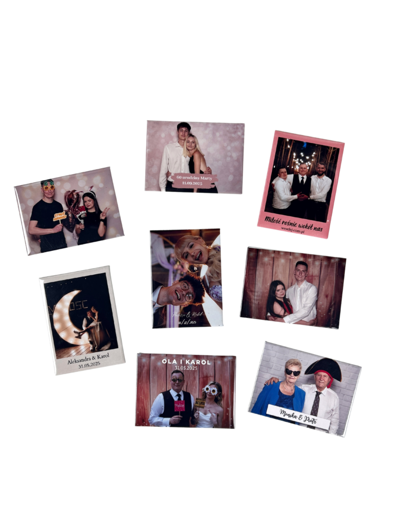 To świetna forma podziękowania dla gości – każdy otrzymuje wyjątkowy, spersonalizowany magnes z Waszego przyjęcia. Możemy wykonać dowolną personalizację: napis, grafikę, ramkę, a nawet magnes w formie wydruku z polaroida. Często nasi klienci wybierają pakiet z klasyczną fotobudką – zdjęcia z niej wykorzystujemy do magnesów, tworząc spójną pamiątkę dla każdego .